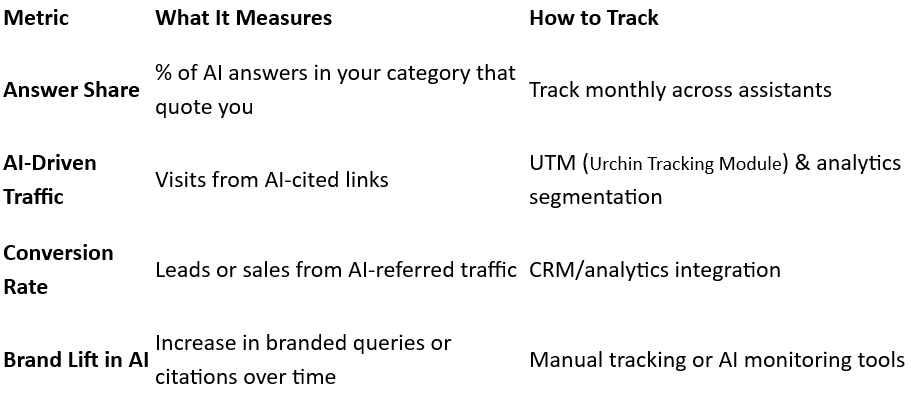 Brand mentions in AI answers (measured manually or via monitoring tools)